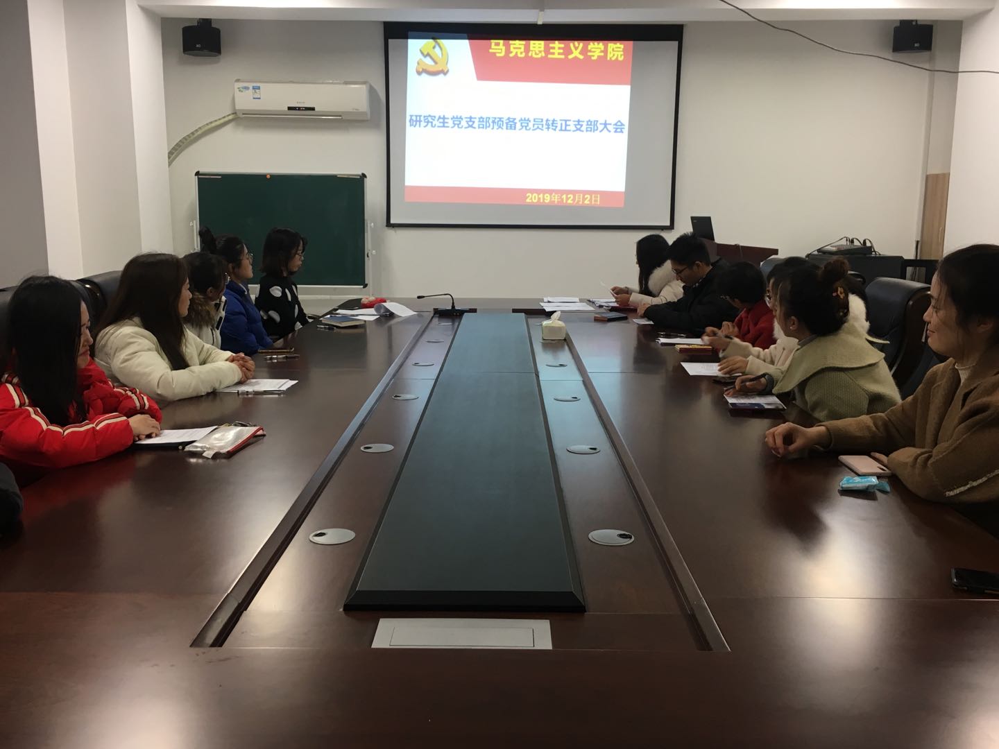 2019年12月2日下午3:00,英国上市公司365研究生党支部预备党员转正大会于文科楼330会议室召开,大会讨论关于徐芸怡、朱玲琳两名同志的转正问题。全体研究生党员参加此次大会,大会由研究生党支部书记刘凤娟主持。