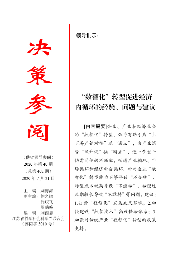 江苏现代信息社会研究基地骨干专家岳中刚教授和首席专家张志华教授合作的研究成果《“数智化”转型促进经济内循环的经验、问题与建议》,近日入选省社科联《决策参阅》2020年第40期。