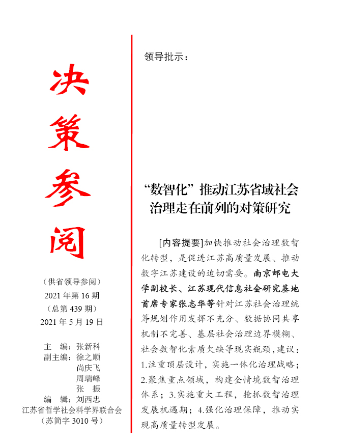 近期,江苏现代信息社会研究基地首席专家张志华教授领衔的研究团队提交的研究成果《“数智化”推动江苏省域社会治理走在前列的对策研究》,被省社科联《决策参阅》采纳用稿。