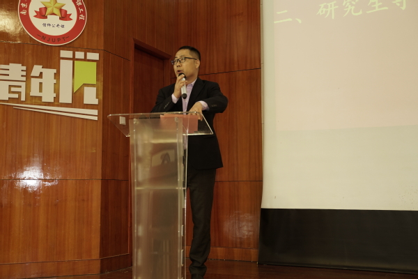 研究生老生代表卫明皓同学从老生的角度给新生介绍了南邮优美的学习环境和丰富的学习资源,结合专业特点对所学专业的学习提出相关建议:希望同学们在马院浓厚的学术氛围中,开拓进取,勇于创新,努力成为堪当民族复兴重任的时代新人。