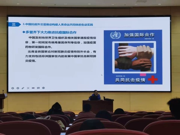 该讲座讲述了习近平总书记提出“共建人类命运共同体”的伟大构想应时顺势,为应对人类面临的共同挑战和世界各国的共同发展提供思想引领和行动方案,体现了对世界大势的清醒判断和对未来走向的准确把握,彰显了我国在全球治理体系中的大国担当。“命运共同体”理念的提出引发国际社会高度重视,并多次被写入联合国的文件。新冠肺炎疫情的爆发和蔓延使人类命运共同体理念更加深入人心,得到广泛的认同。中国从多层次、多领域推进人类命运共同体的构建,抗疫的国际合作践行了人类命运共同体的构建,中国抗疫外交是推动构建人类命运共同体的生动实践。构建人类命运共同体面临着诸多挑战,也面临难得的机遇,因命运共同体是对马克思主义“真正共同体”的继承和发展,构建人类命运共同体彰显了马克思主义的历史使命,中国在抗疫大考中的表现,为构建人类命运共同体增添了新的吸引力。我们坚信,只要世界各国团结一心,精诚合作,人类一定能够经受住这次疫情带来的考验与洗礼,推进人类命运共同体构建的进程。