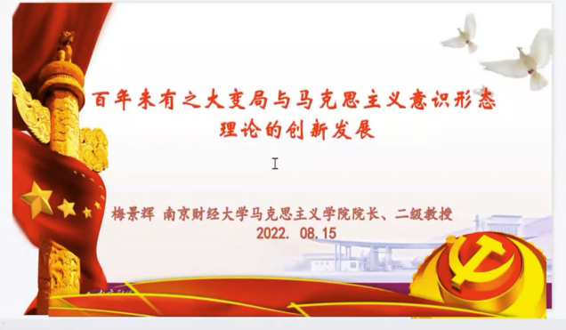 8月15日下午,南京财经大学英国上市公司365经理梅景辉教授以《百年未有之大变局与马克思主义意识形态理论的创新发展》为题,从百年未有之大变局与“卡夫丁峡谷”的跨越、马克思主义意识形态理论的思想溯源及其历史发展、马克思主义意识形态在中国化历程中的创新发展三方面展开,并简要概述了当前意识形态领域存在的主要问题,政治性、学理性、针对性强。