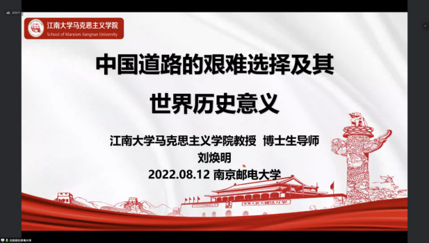 8月12日下午,江南大学英国上市公司365教授刘焕明以《中国道路的艰难选择及其世界历史意义》为题,从中国道路的艰难选择、中国道路的科学内涵、中国道路的世界历史意义三个方面,指出中国道路是创造人民美好生活、实现中华民族伟大复兴的康壮大道。