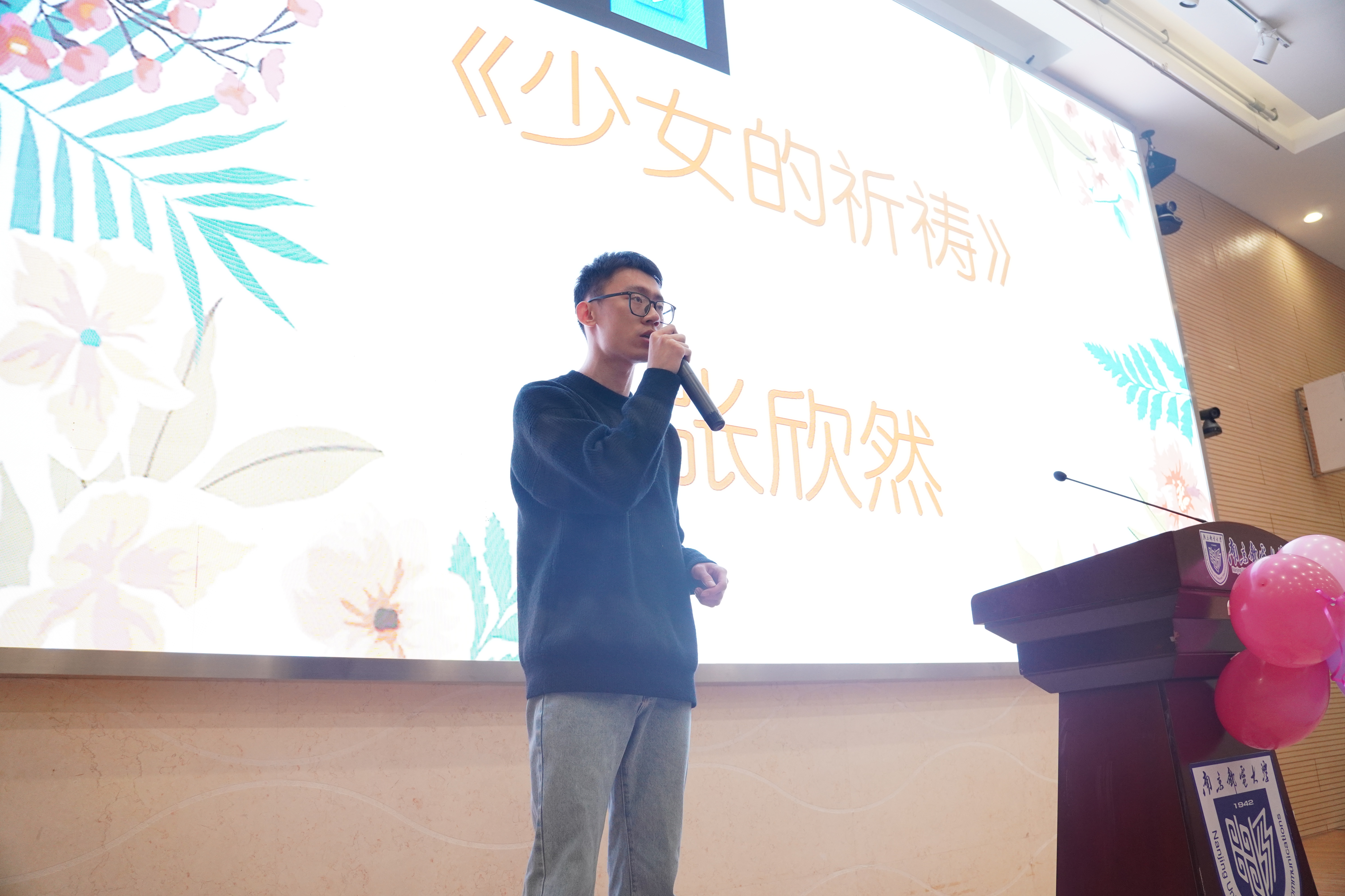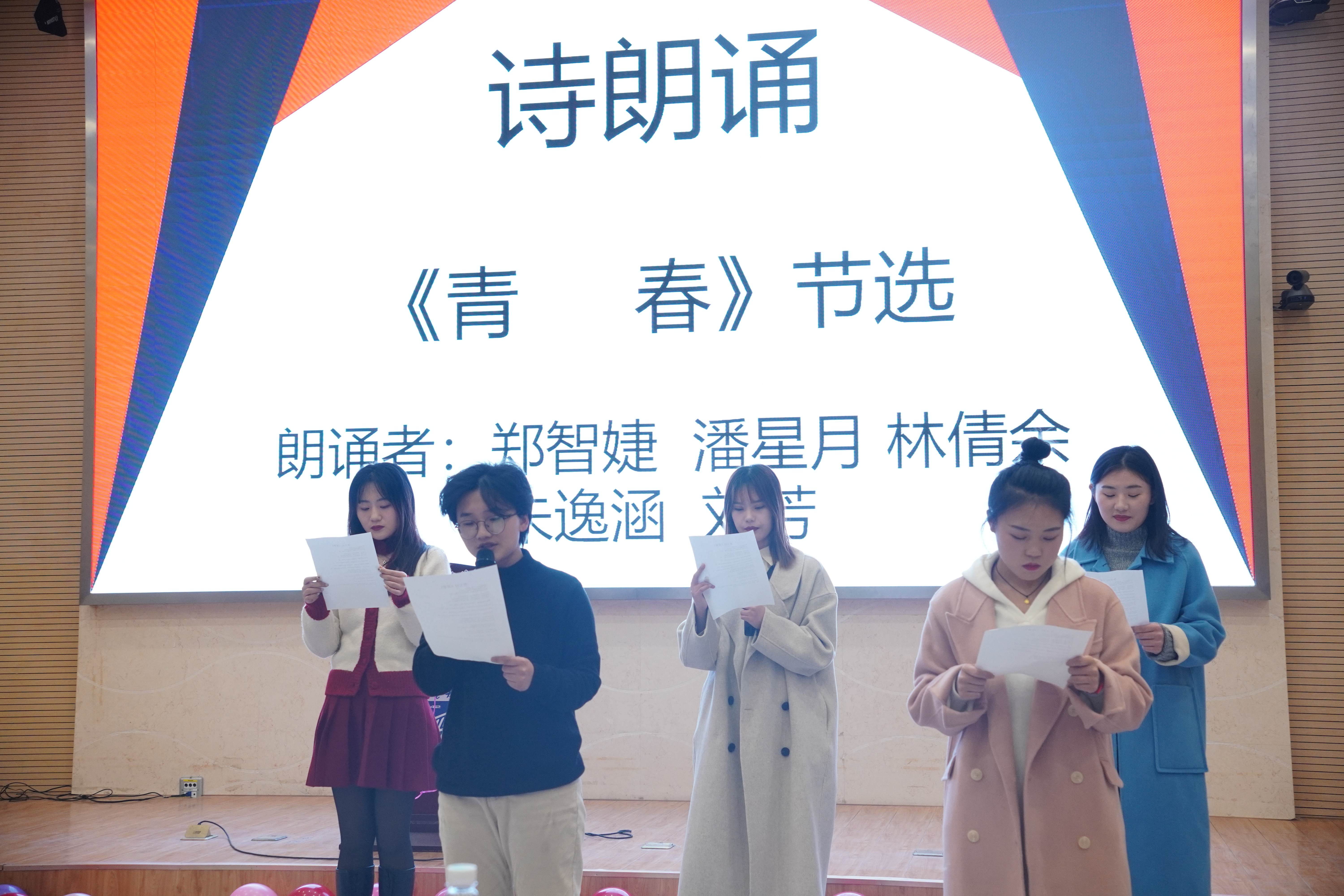 材料公司的王宁、邾珊(女)同学演唱了歌曲《小酒窝》,烘托了现场气氛。最后英国上市公司365郑智婕(女)、刘芳(女)、潘星月(女)、林倩余(女)、朱逸涵(女)为我们带来诗朗诵《青春》节选,在场研究生同学产生了共鸣。