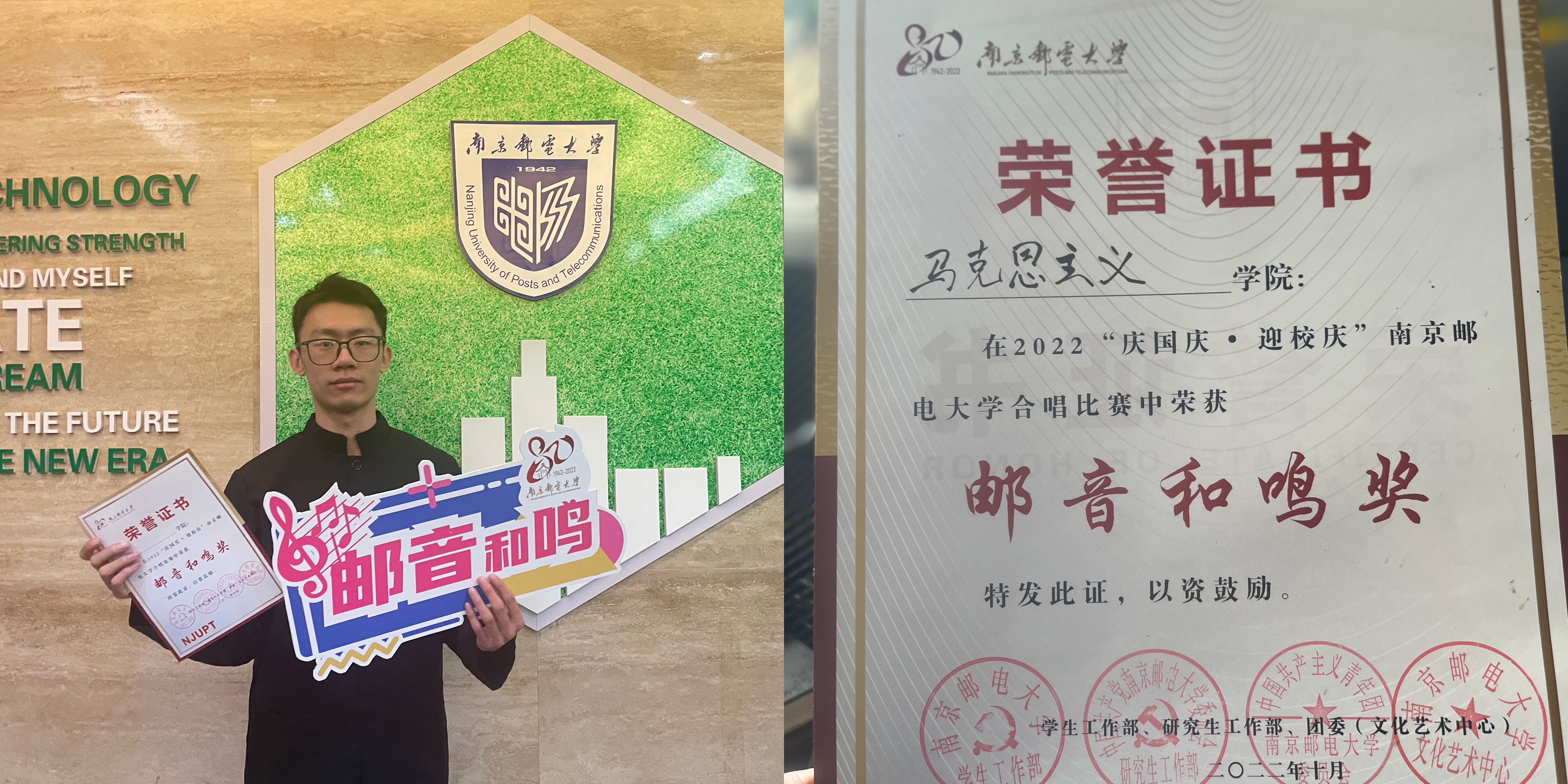 为喜迎二十大的召开,庆祝祖国成立73周年,迎接南邮80周年华诞,公司组织的“庆国庆·迎校庆”大合唱比赛,全校共有21个公司参与比赛,作为唯一的一支研究生参赛队伍,马院研究生最终以一曲《我和我的祖国》荣获了“邮音和鸣”奖。