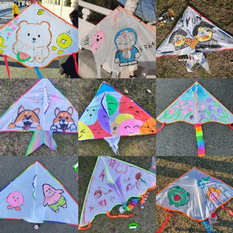 选2号风筝的同学,手持着颜料与画笔,将风筝变成了一张独特的艺术画布。红橙黄绿青蓝紫、海绵宝宝、派大星、鲸鱼、皮卡丘、汪汪队……以及那些可爱、搞怪的表情包和简笔画,样式丰富多彩,让人眼花缭乱,大家都沉浸地享受着奇妙的创意盛宴。蔚蓝的天空是我们奔放的画布,每一只风筝都是我们独一无二的艺术品,记录了我们在羊山公园共度的美好时光。