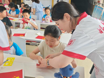 在所有宣讲环节结束后,实践团还组织了一场“星环筑梦,爱国折艺”的手工课,耐心指导孩子们制作五星红旗和风车,最终大家兴奋地将自己的作品高高举起。一天的活动在合影留念中画上圆满的句号。