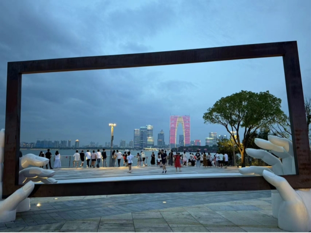 在金鸡湖畔,实践团欣赏到了美丽的湖光山色,也看到了当地政府在生态环境保护方面所做的努力,深刻理解了习近平总书记关于区域协调发展和生态文明建设方面的重要论述,而在东方之门这一地标建筑下,团队成员亲身感受到了江苏经济社会发展的蓬勃活力和巨大潜力。三十年前,1994年5月12日,在苏州东部的金鸡湖畔,一片低洼的田野上,随着第一根桩的深深扎入,苏州工业园区正式破土动工。从那一刻起,这里便踏上了探索高质量发展的非凡征程。三十年间,昔日的“姑苏城东、水田洼地”已华丽转身,成为名副其实的“创新之城、非凡园区”。
