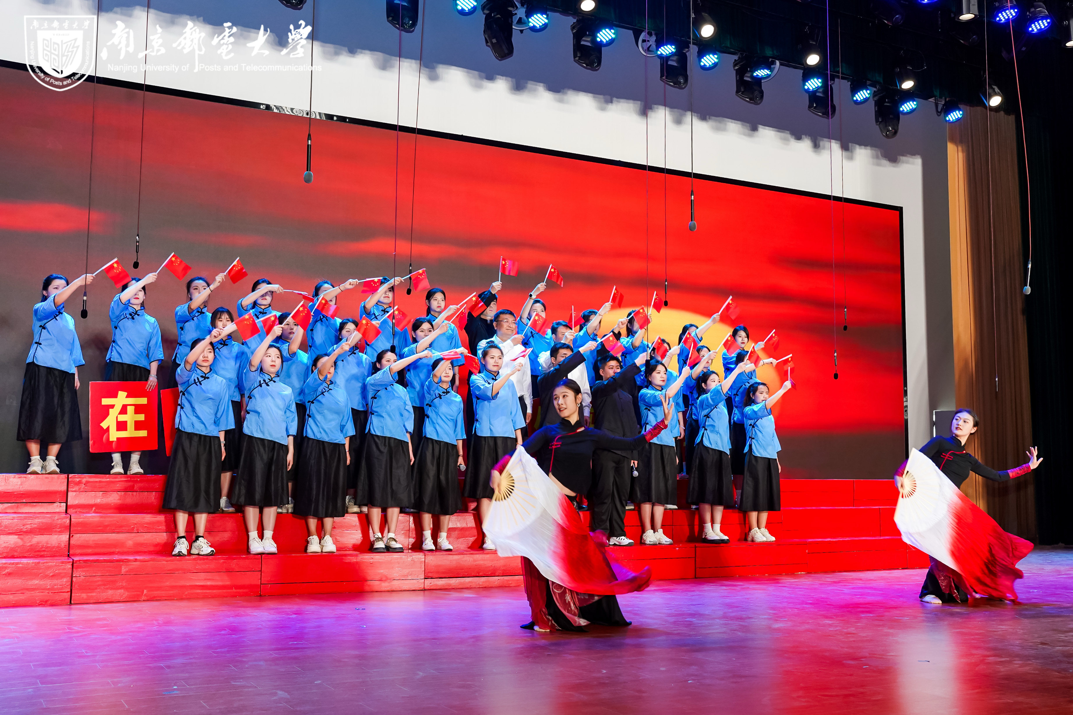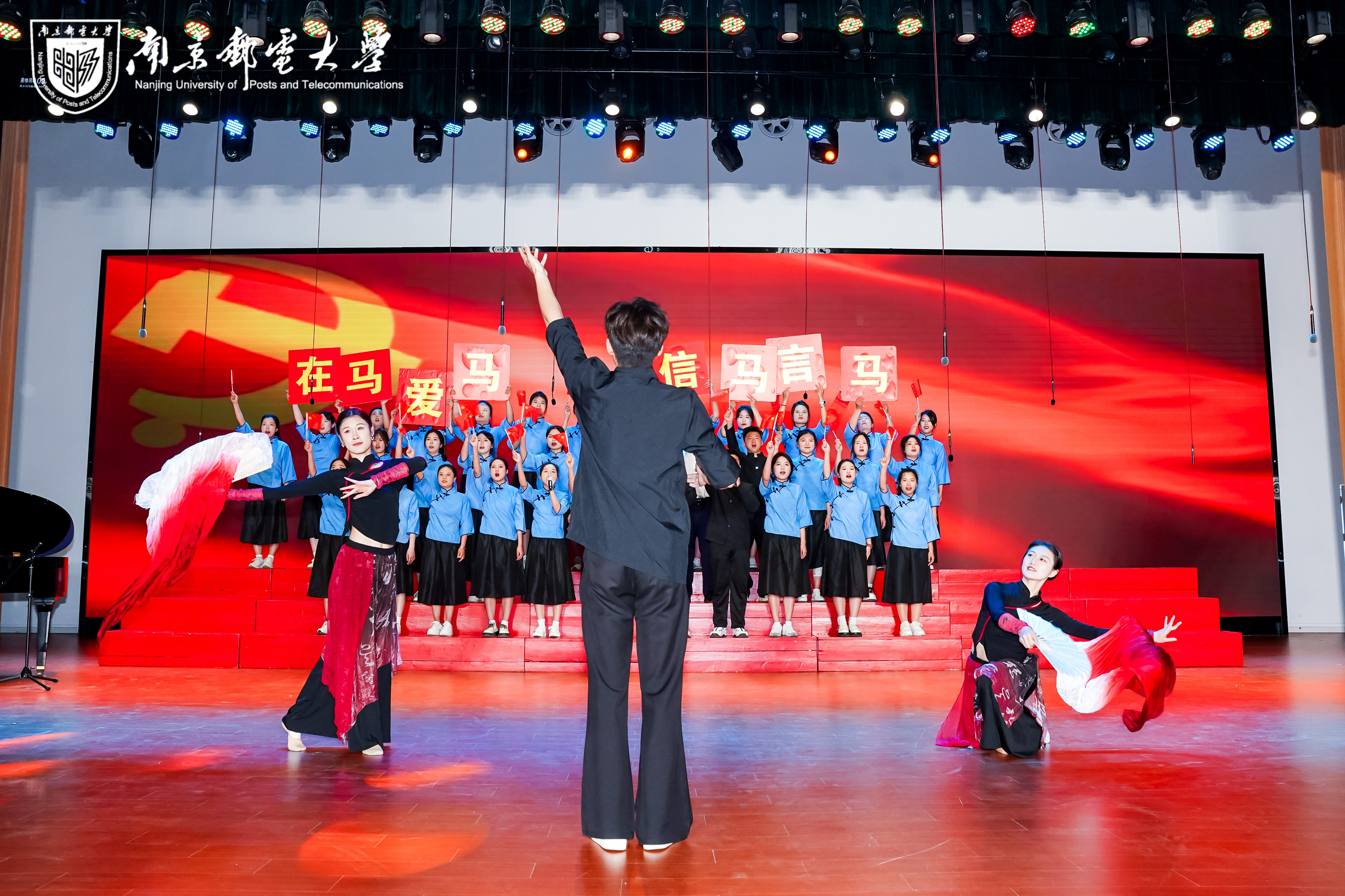 为更好地展现马院研究生的风采,公司研究生会在赛前积极组建研究生合唱队伍,选定歌曲并排练。同学们利用课余时间认真刻苦练习,黄洁老师多次莅临现场指导排练。在舞台上,马院研究生身着黑色中山装与蓝衫黑裙与两位公司领导们一同高唱歌曲《党旗飘扬的方向》,“你看党旗飘扬的方向,是我要去胜利的地方…”,配合舞蹈和五星红旗等多种元素使舞台丰满唯美。马院师生以铿锵之音、激昂之姿登台献唱,以昂扬旋律唱出莘莘学子意气风发之态,以激昂乐章颂扬新时代中华民族伟大复兴之壮丽史诗。整场表演亦歌颂了马院师生对共产党的坚定信念与崇高信仰,并将马院学子朝气蓬勃、奋发向上的精神风貌展现得淋漓尽致。