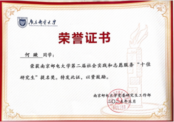 何璇同学获评第二届社会实践和志愿服务“十佳研究生”提名奖