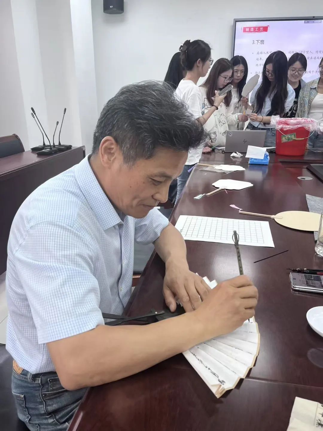 活动伊始,黄洁老师首先简要介绍了端午节的传统意义,在端午节这个特殊的日子里绘制漆扇,寄托了人们对美好生活的祝愿。同时,还结合当代生活,鼓励同学们在创作中融入现代审美元素。随后,研究生会主席陈巍巍向同学们介绍了漆扇的文化背景及制作技巧,展示漆扇制作具体流程,邀请同学上台进行互动体验,现场气氛热烈而专注。