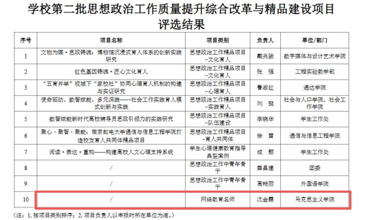 9月16日,公司第二批思想政治工作质量提升综合改革与精品建设项目评选结果正式公布。经专家严格评审,全校共评选出10项优秀建设项目。公司沈金霞老师凭借其在网络思想政治教育领域的突出表现,成功获评“网络教育名师”项目。