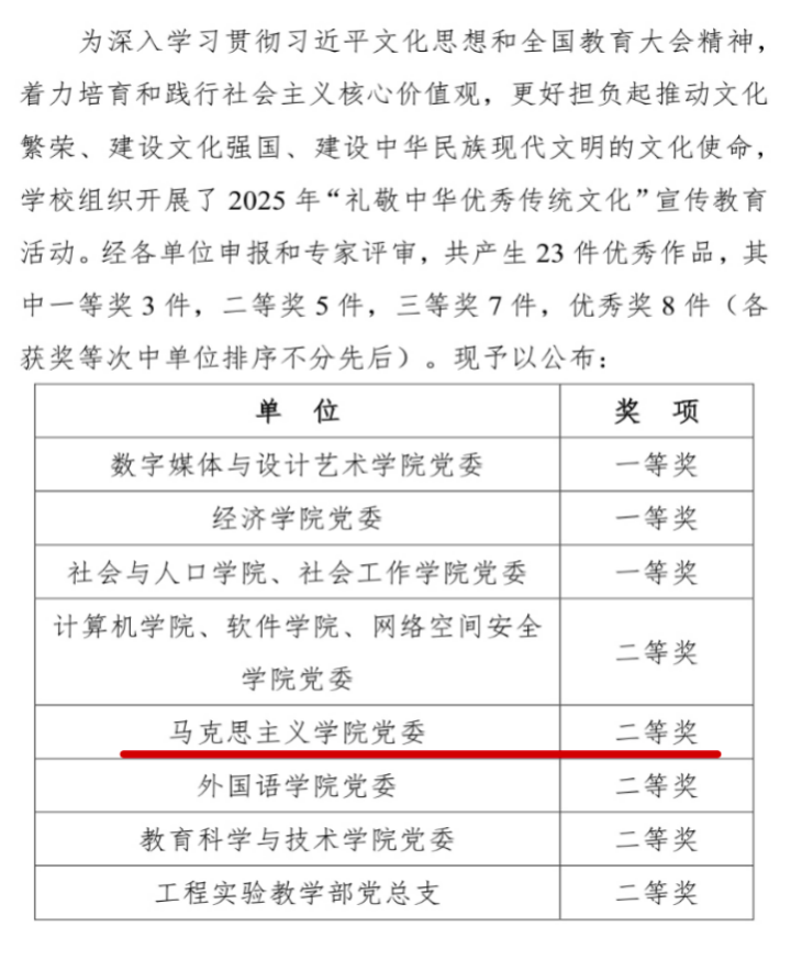 最终,作品荣获“礼敬中华优秀传统文化”宣传教育活动校级二等奖。这一成绩不仅是对公司师生深入挖掘红色资源、创新思政教育形式的充分肯定,更彰显了公司在新时代文化育人中的使命与担当。公司将持续深化“大思政课”建设,推动中华优秀传统文化融入思想政治教育全过程,引导青年学子在赓续中华文脉、红色血脉中汲取精神力量,在坚定文化自信中展现青春作为,担负起推动文化繁荣、建设文化强国、建设中华民族现代文明的青春使命!