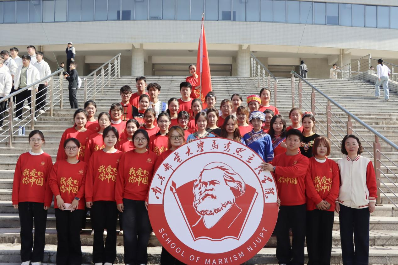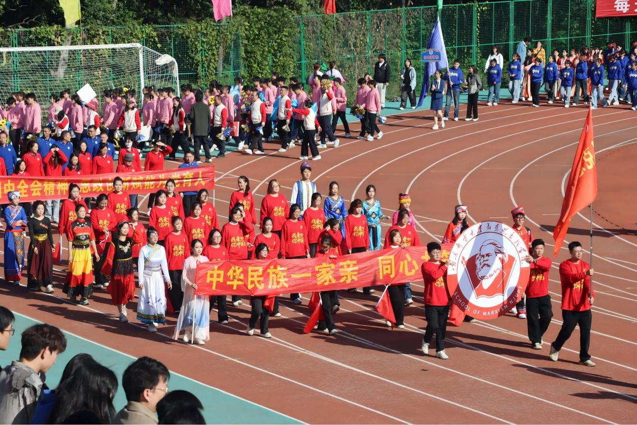 运动会开幕式上,公司师生方阵迈着铿锵步伐走过主席台,尽显昂扬姿态和马院特色,红色院旗、红色院徽、红色“我爱中国”服装⋯⋯ 在红色赛道、绿茵场上那抹红色格外亮眼,绽放马院风采。随后,一曲《最炫民族风》悠然响起,身着汉族、蒙古族、彝族等特色服饰的和同学们,跳着雀跃的舞步随着乐声流转,民族文化魅力与马院思政担当同频共振,传递出团结向上的精神力量。